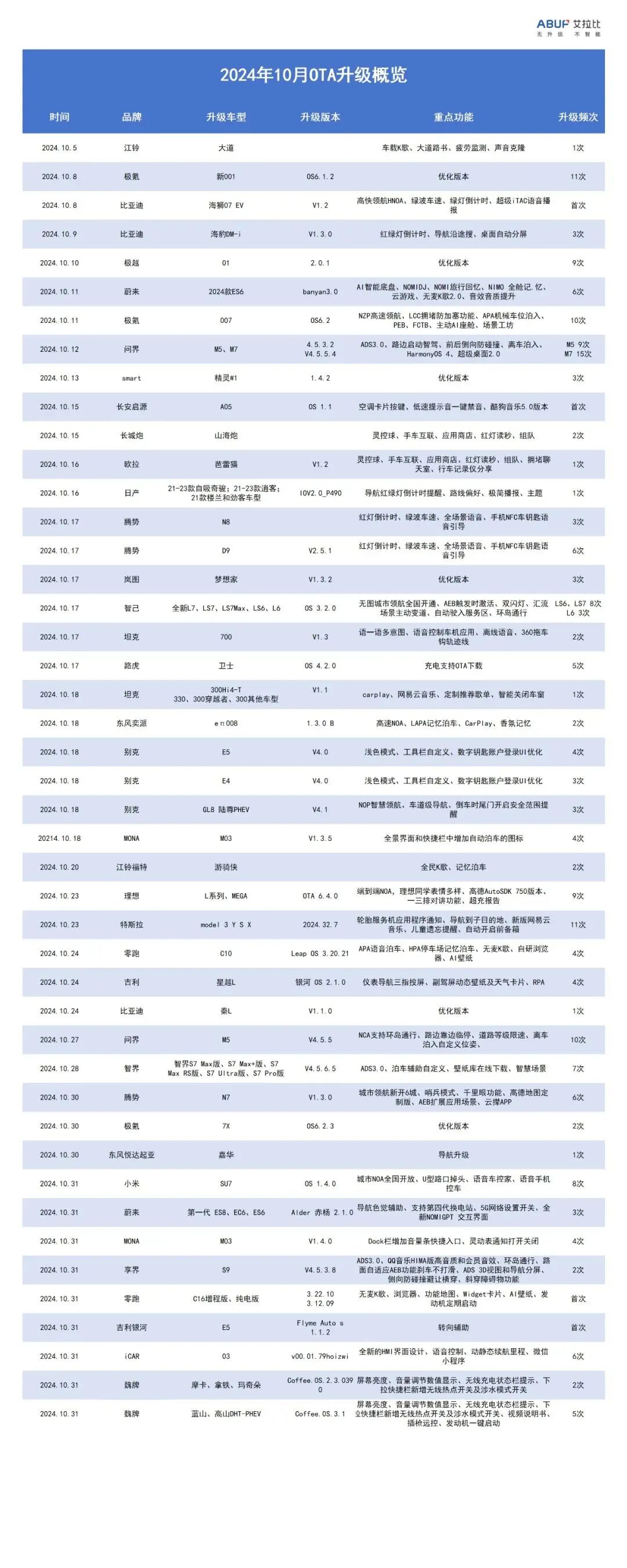 汽车OTA正在如当初所期待般,变得像呼吸一样平常。小鹏MONA系列产品负责人杨光10月透露,公司已经规划了6次大规模OTA更新,平均每个月一次,以持续迭代MONA系列的功能。要知道,小鹏MONA 03 在8月底才刚刚上市。当汽车月更成为常态,不少车企默契的将每月最后一天作为交作业的deadline。进入第四季度,更是到了车企OTA团队“冲业绩”的时候,不少重量级升级已经在路上了。据汽车行业评论和艾拉比的联合统计,发布年末OTA计划的车企将超过30家。比如,智己智驾项目总监王康发博称,11、12两个月,智己将会对旗下车型推送两次OTA;理想汽车OTA 6.5版本车机系统将于11月底正式推送,截至2024年11月中旬,理想汽车今年累计完成17次产品OTA升级,优化和新增功能近1000项。在更新产品的同时,OTA的限制正在减少。小米汽车宣布,小米SU7 支持在地库等没有信号的地方进行 OTA 升级,尽管后面还是有个括号,建议车主选择信号良好的环境进行升级操作,但已经向前迈了一大步。小米官方强调,升级前,车辆升级所必须的升级包已经下载完成且经过了系统校验,因此整个升级过程是无须下载新数据的。在升级过程中,车辆会有状态数据上报,万一升级出现异常,服务中心第一时间感知到并通过远程方式修复,避免车辆无法挪动的情况。如何让用户对新版本OTA有更清晰的认知,并激起用户的更新使用欲望,理想在最新的OTA6.4.0中给出了不错的答案。理想汽车优化了OTA更新说明展示效果,将内容分为“亮点功能”、“智能驾驶”、“智能座舱”等多个模块,并通过卡片形式展示,查找更新内容更方便。同时,扩充理想同学的OTA问答能力,支持通过语音查询状态和预约OTA升级。这一举措尤其对低频OTA车型提高OTA下载率大有帮助。不仅有软件升级,小鹏汽车还首开硬件升级的先例。智能新能源汽车升级迭大大加快,受硬件条件限制,老车主眼看着新车的上市,只能抱怨自己是韭菜。11月11日,小鹏汽车在AI科技日盛会中,向外界公布以众筹的方式进行芯片升级,将选择权交给车主自己。