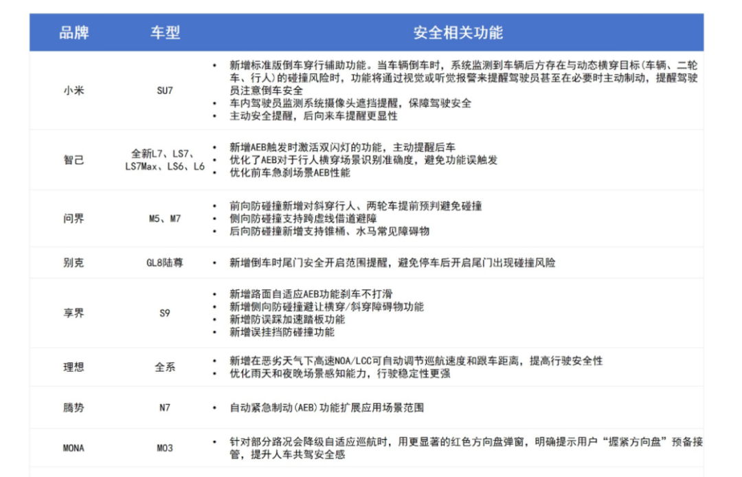 OTA在助力智驾安全方面也做出了实实在在的贡献。特斯拉发布2024第三季度安全报告显示,截止2024第三季度,开启Autopilot自动辅助驾驶的特斯拉比普通车辆安全性高10.5倍。问界2024涉及主被动安全的OTA相关版本近10个。2024年特斯拉智驾相关版本迭代的次数已超过25次。10月,提及行车安全的OTA功能数多达50+,车企从AEB、LDW、自适应大灯系统、盲区监测等多个方面推送新功能并优化体验,为安全加码。