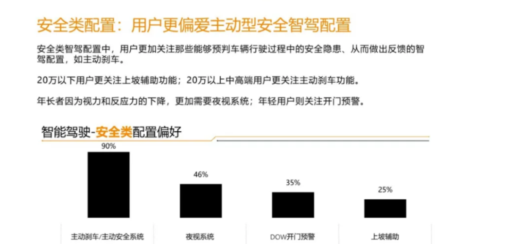 智能驾驶飞速发展的今天,安全仍然是用户的首要关注点数据显示,消费者最为关注的安全类配置主动刹车在2022年实现了飞跃性的增长后,稳步上升,至2024H1市场渗透率已经达到53.3%。20万以上中高端用户更关注主动刹车功能,20万以下用户更关注上坡辅助功能。