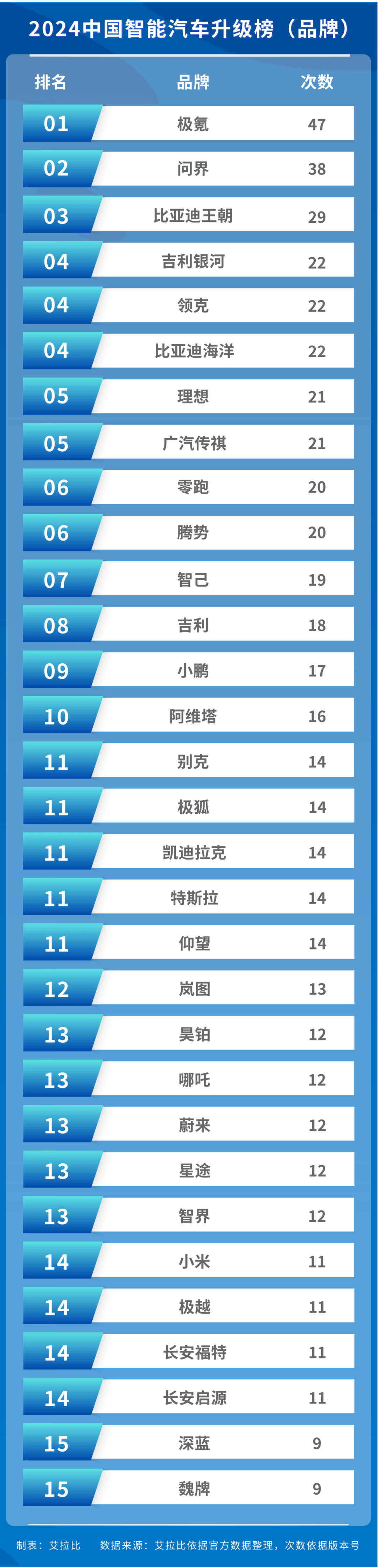 从榜单看,23个品牌完成了月更一次的KPI。吉利系开挂,极氪一年47次OTA位列榜首;吉利银河和领克分别完成了22次OTA,吉利品牌18次。别人是和竞品比,吉利是和自己人比。