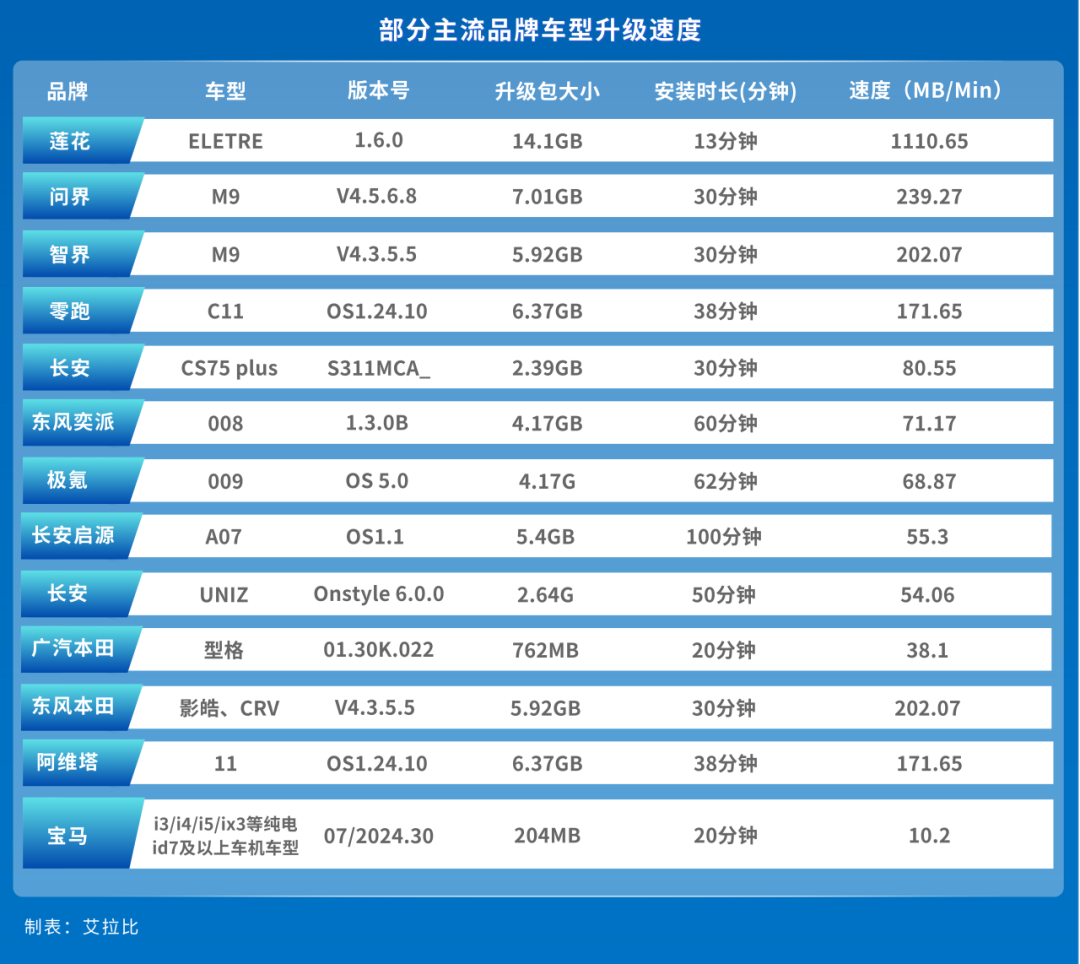 与此同时,越来越多车企的升级速度跑进30分钟大关,值得一提的是,通过追踪问界全年的升级时长发现,安装速度已经从2024年年初的34.82MB/Min提升到年末的239.27MB/Min,加速显著。