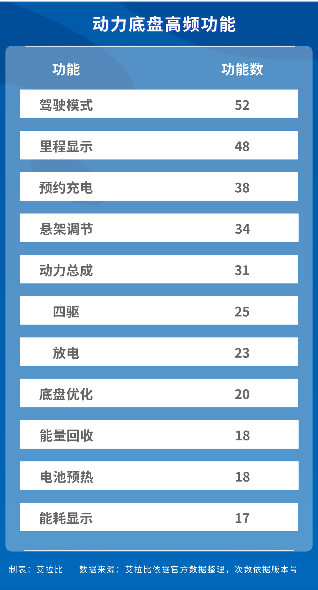 动力底盘相关的OTA升级主要聚焦于驾驶模式、里程显示、预约充电、悬架调节等功能,反映了车企对用户高度关注的补能、能耗以及驾驶乐趣的积极响应。
