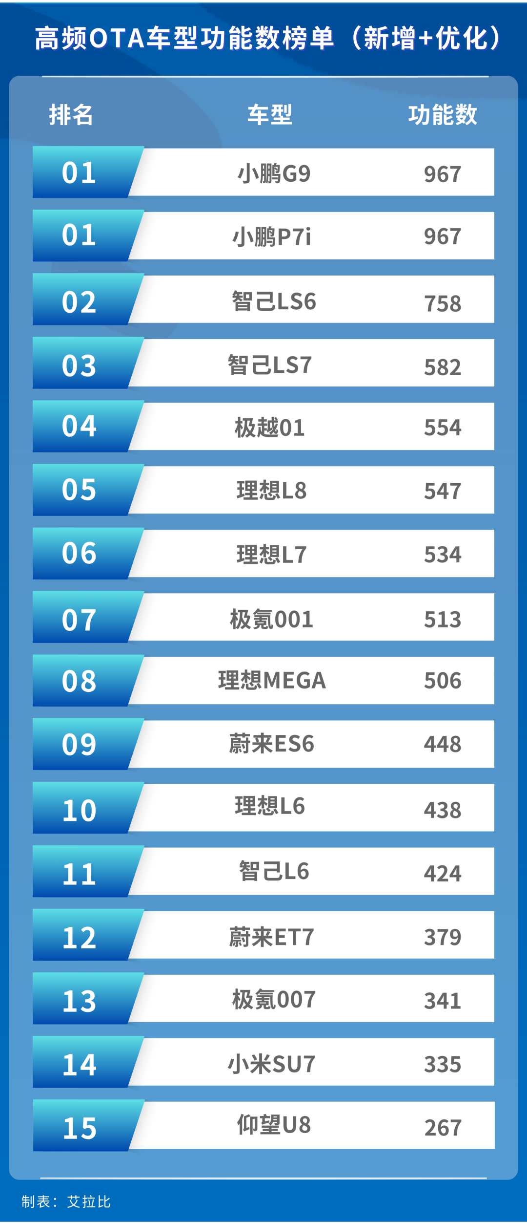 在智能驾驶攻城略地的过程中,OTA成为最大载体,各大品牌全年共计完成1898项功能更新,与智舱功能数量的差距逐渐缩小。