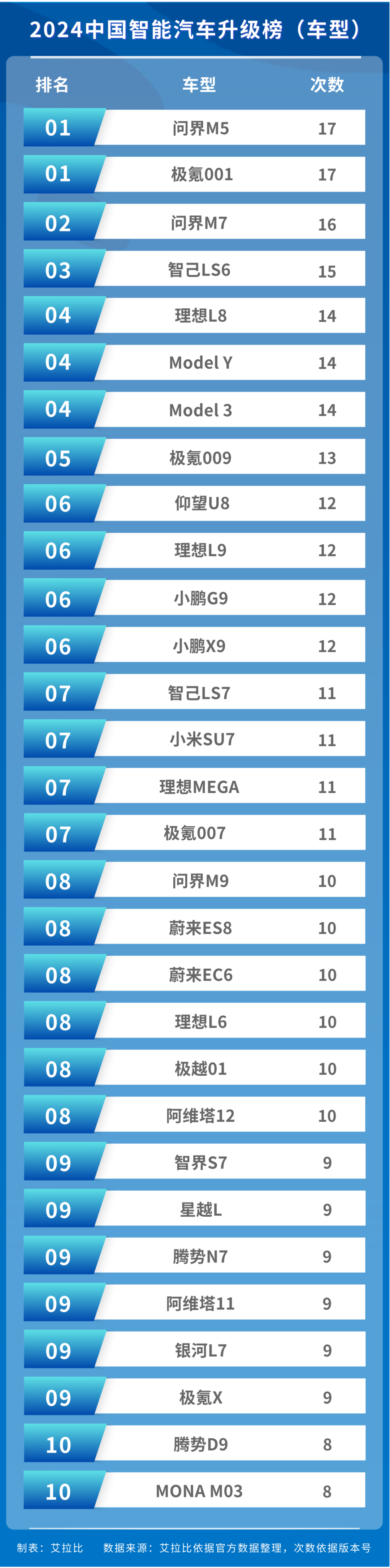 车型榜单上,问界M5和极氪001升级次数达到17次,以1.4次/月(不含公测版本)的升级频次稳定在榜首。问界M7紧随其后,智己LS6升级次数15次,特斯拉Model 3和Model Y的升级次数达到14次,足以看出竞争的白热化。