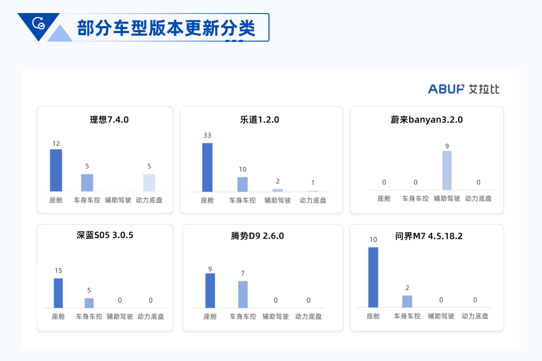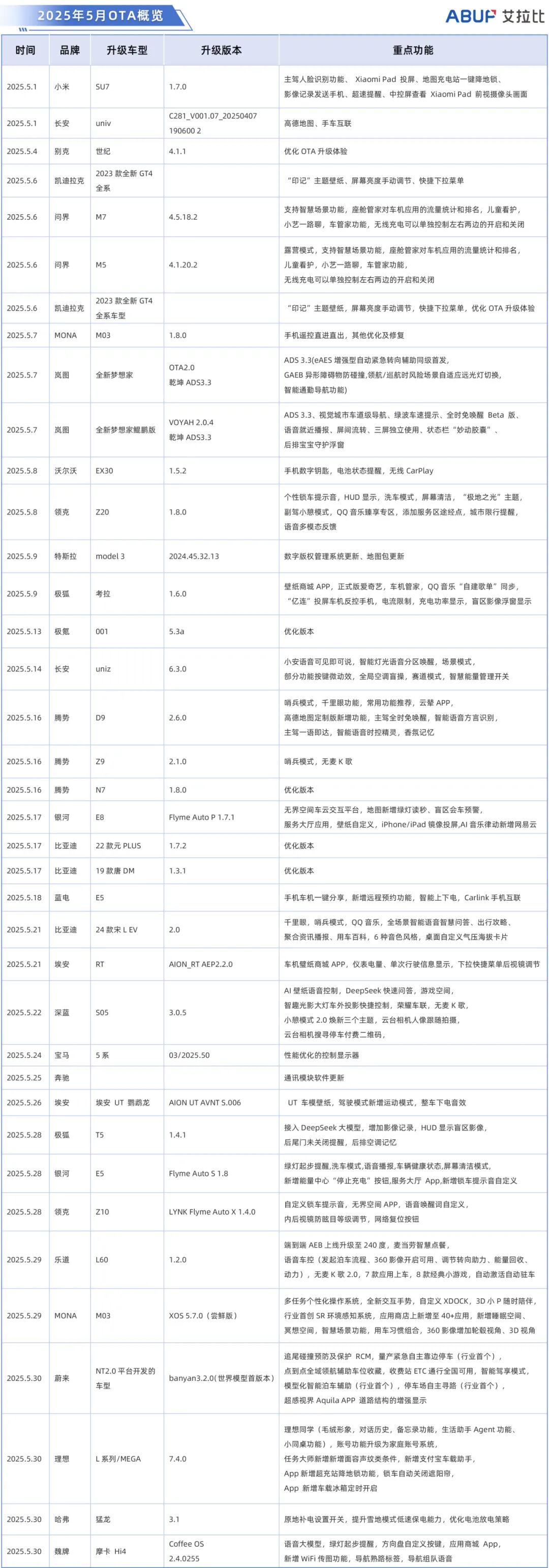 5月除了新势力们保持更新,比亚迪、吉利、长安、长城、奇瑞也在近两个月中贡献了70%的OTA流量。其中魏牌独占4席,13个品牌推送了2个及以上版本。合资品牌中,上汽通用保持一直以来稳定的输出节奏,成为合资品牌中少数未受新政影响的"定海神针"。