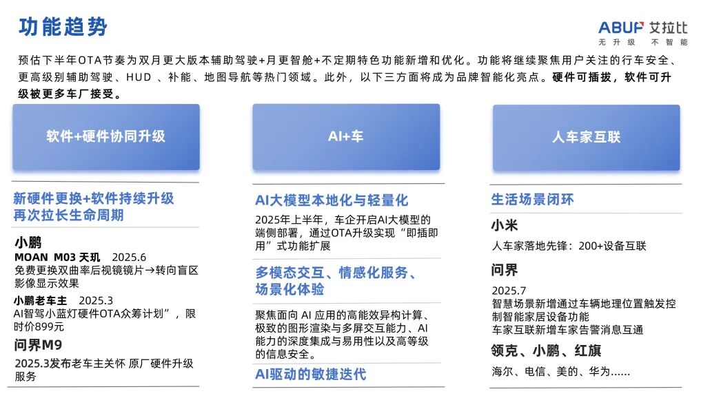 下半年,随着合资品牌全面加入战局,OTA覆盖的品牌与车型规模将进一步扩大。市场将呈现以下关键趋势: AI驱动的敏捷迭代成主流: 基于大模型的语音交互(如理想同学、小艺)、场景化服务生成(如任务大师、智慧场景)、以及开发效率提升(如小鹏强调的AI能力深度集成)将成为核心竞争力。预估主流节奏将是“双月大版本(辅助驾驶)+ 月更(智舱)+ 不定期特色更新”。