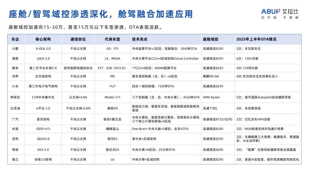 生活场景闭环构建护城河:领先品牌将不再满足于单点功能升级,而是致力于打造“车-人-家”无缝衔接的体验闭环(如理想的生活助手、家庭账号;问界的车管家、碰一碰流转)。 舱驾融合加速落地: 座舱域控制器向15-30万甚至15万以下主力市场加速渗透,为更深度融合舱驾功能(如基于导航信息的智驾策略优化、多屏交互与智驾信息联动)提供硬件基础,推动OTA内容深化。 安全普惠与体验差异化并重:一方面,高阶安全功能(如AEB增强、盲区监测升级)和实用智驾能力(如高速NOA)将持续向中低端车型渗透;另一方面,品牌将通过独特的AI应用、娱乐生态、视觉主题(如AR-HUD定制)塑造差异化体验。