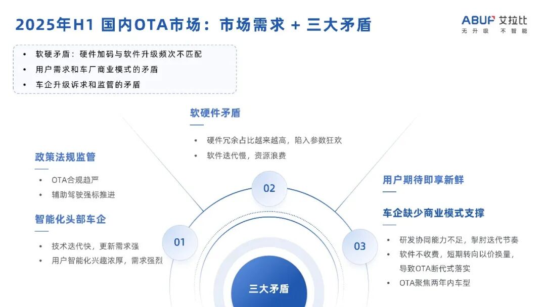 U型数据背后是OTA行业在智能化浪潮中奋力搏击的缩影,也清晰勾勒出三大结构性矛盾: 1. 软硬件的“错位共舞”: 车企不断加码预埋高性能硬件(如传感器、算力平台),为未来功能释放预留空间。然而,当前软件功能的开发、验证与释放速度,特别是受限于辅助驾驶等高阶功能的成熟度与法规,难以跟上硬件的步伐,导致部分硬件潜能闲置。 2. 用户渴望与车企动力的“拉锯战”: 消费者对“常用常新”的智能化体验需求日益高涨,但部分传统车企受制于研发投入、组织架构调整速度以及对升级带来的潜在风险的顾虑,升级动力仍显不足。 3. 升级诉求与监管的“磨合期”:车企希望通过高频迭代保持产品竞争力,但日益完善的监管框架(尤其涉及驾驶安全的功能)对升级流程、安全验证提出了更高要求,短期内抑制了部分企业的升级节奏。