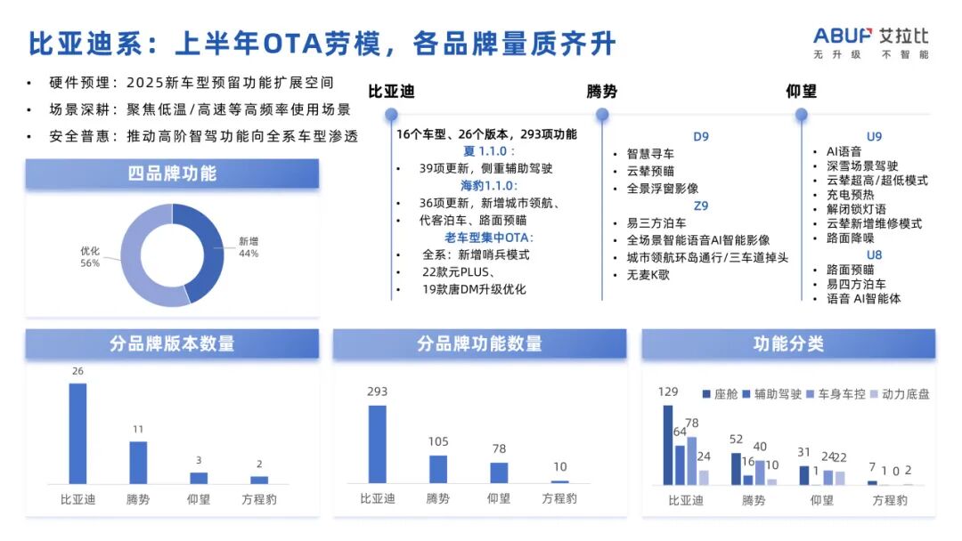 比亚迪系:智驾平权为核心的OTA规划部署效果显著。上半年推送版本高达24个,覆盖王朝、海洋、腾势、方程豹等多品牌。其升级不仅频率高,更注重实用价值:低温/高速场景优化、高阶智驾安全普惠、硬件预埋(如新车型预留扩展空间)是其关键词。
