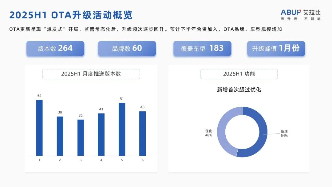 2025年4月15日,市场监管总局发布《关于进一步加强智能网联汽车产品准入、召回及软件在线升级管理的通知》系列解读——汽车软件在线升级(OTA),其中要求企业实施OTA升级活动,应当按要求向市场监管总局备案,并确保实施OTA升级活动后的汽车产品符合国家法律法规、技术标准及技术规范等相关要求。 立竿见影的,汽车OTA升级频次经历了短暂回调,尤其是在2月和3月,车企OTA的频次明显下降。一时间,着急的车主甚至在社交媒体上问起了“各大车企OTA为何迟迟不上新”,甚至有“汽车OTA消失”的谣言传出。 然而,智能化的未来不可阻挡,5月车企OTA频次又展现出强劲的回升势头。据艾拉比统计,2025年上半年,国内OTA市场累计推送版本数依旧达到了264个,覆盖60个品牌、183款车型。