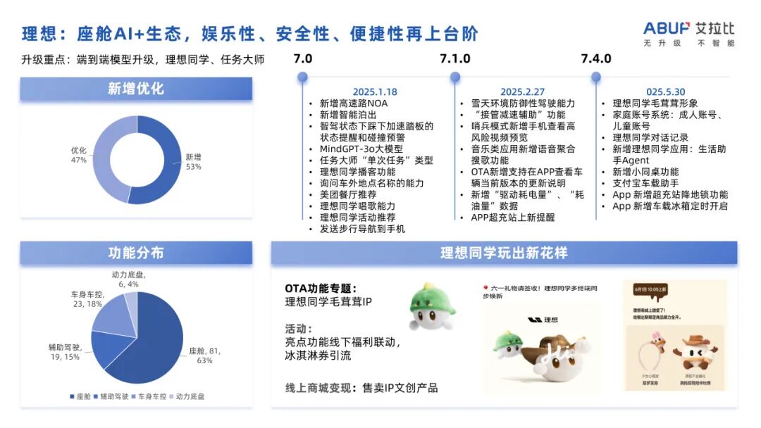 理想:AI+生态,打造体验升维:7.0到7.4版本升级,聚焦“AI驱动的任务大师”、“理想同学”能力跃升(播客、唱歌、地点询问、活动推荐)以及生态扩展(美团餐厅、支付宝车载、生活助手)。座舱娱乐性、安全性(如高速NOA、防误踩提醒)、便捷性(发送步行导航到手机)达到新高度。
