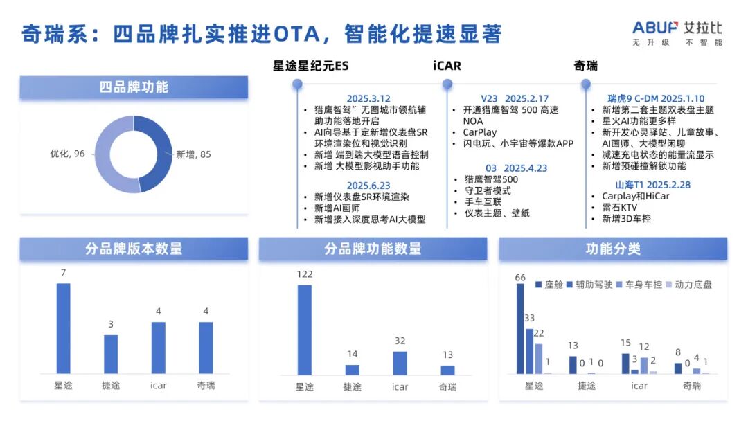 奇瑞系:四箭齐发,智能化提速:奇瑞、星途、捷途、iCAR四大品牌上半年共推送48个版本。功能落地扎实:星纪元ET新增仪表SR环境渲染、AI画师、深度思考大模型接入;瑞虎9 C-DM新增双表盘主题;探索06新增守卫者模式等,智能化体验显著提升。
