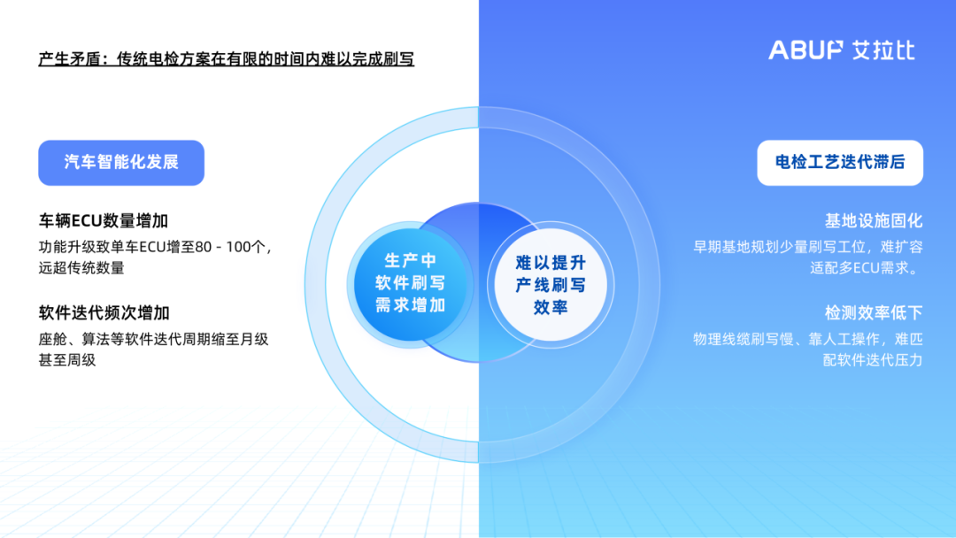 生产电检是汽车制造的关键环节,车企在建设生产基地时,通常会在总装工艺中部署专业的电检系统和诊断设备。但随着汽车智能化程度提升,以智驾和座舱为重点的 ECU 软件迭代加快 —— 为确保车辆出厂时搭载最新版本软件(解决缺陷、提升体验),生产中需要刷写的软件数量大幅增加。 面对这些变化,传统依赖物理诊断设备的电检方式逐渐暴露出与产业升级节奏不匹配的问题:一方面,其通过物理线缆在 OBD 口插拔的操作依赖人工,效率低且易受人为因素影响;另一方面,OBD 接口通信速率有限(≤500 Kbps)无法支持并行刷写,在需要刷写多个 ECU 时,刷写的效率问题更加突出。