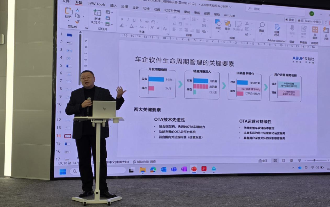 10月24日,上汽大众软件工程师俱乐部“1024 Techday”于上汽大众技术研发中心成功举办。艾拉比作为上汽大众合作伙伴受邀出席,现场展示了艾拉比全栈软件解决方案矩阵。专家技术分享环节,艾拉比副总裁贺思聪围绕“OTA技术趋势洞察和软件全栈开发实践”发表主题演讲,与上汽大众研发团队展开深度技术交流。 (图1)艾拉比副总裁贺思聪(右一)为上汽大众 技术专家现场演示全栈软件解决方案