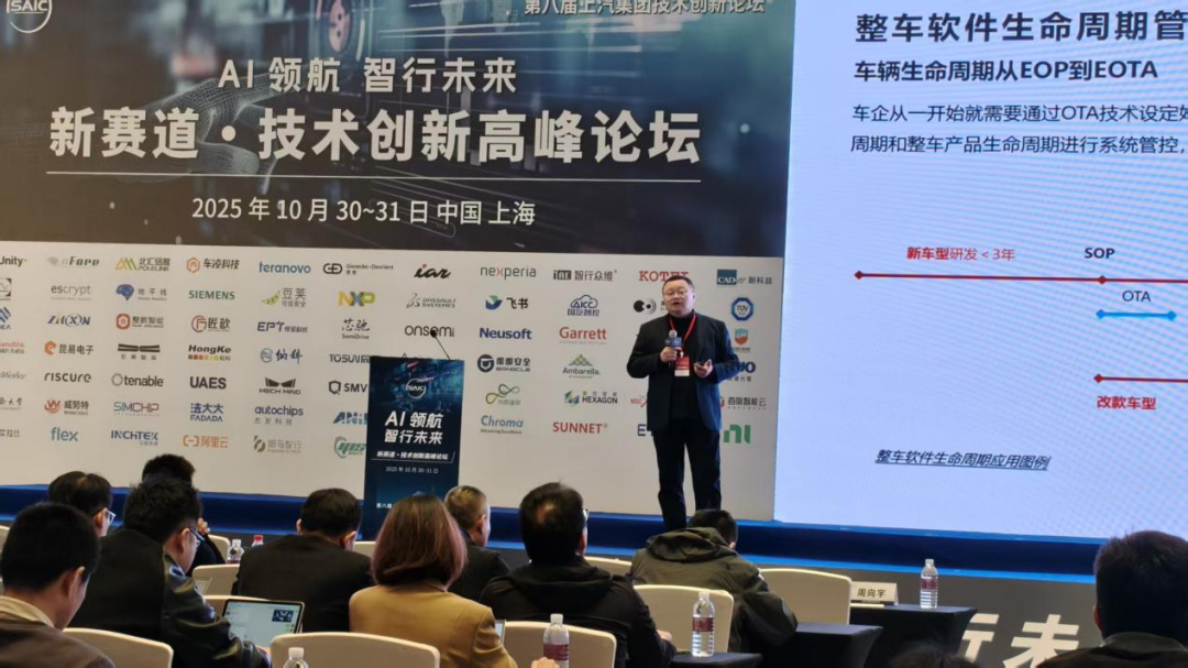 10月30-31日,由上汽集团主办的“第八届上汽集团新赛道•技术创新高峰论坛”在上海嘉定圆满落幕。本次论坛以“AI领航、智行未来”为主题,重点聚焦软件定义、汽车安全、智能驾驶、智能座舱等行业热点,吸引了众多车企、技术供应商及行业专家参与。作为上汽集团在OTA及软件领域的重要合作伙伴,上海艾拉比智能科技有限公司受邀出席,副总裁贺思聪在论坛上发表主题演讲,分享了《高效的整车生命周期软件管理》的行业洞察与实践成果。 图:艾拉比副总裁贺思聪受邀发表演讲
