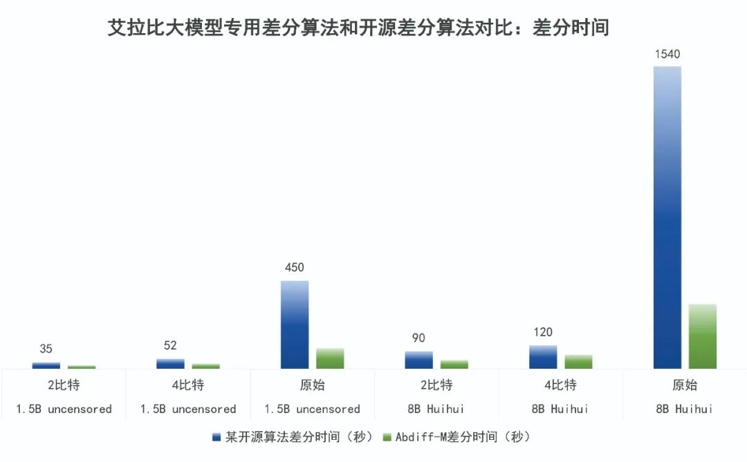 差分包大小:以DeepSeek的1.5B 4比特模型为例,ABDiff-M生成的差分包仅为90MB,而开源算法需要400MB,艾拉比差分包大小仅为原包的5.7%,是开源算法差分包的22.5%。对于8B 4比特模型,ABDiff-M的差分包大小为0.27GB,而开源算法需要1.35GB,艾拉比差分包大小为原包的5.2%,是开源算法差分包的19.9%。差分时间:以DeepSeek的1.5B 4比特模型为例,ABDiff-M的升级时间为开源算法的50%。8B 2比特模型的升级时间是开源算法的51%。