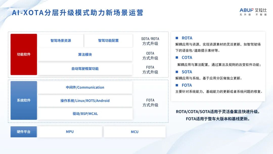01 AI-XOTA解决方案: 分层升级架构与算法效率革新 作为全球领先的OTA技术赋能者,艾拉比凭借AI-XOTA解决方案,以创新之力重新定义车辆的“生命力”。 针对车企软件迭代的效率瓶颈,AI-XOTA通过模块化架构设计,分层解耦轻量化升级与差分算法优化重新定义升级标准。