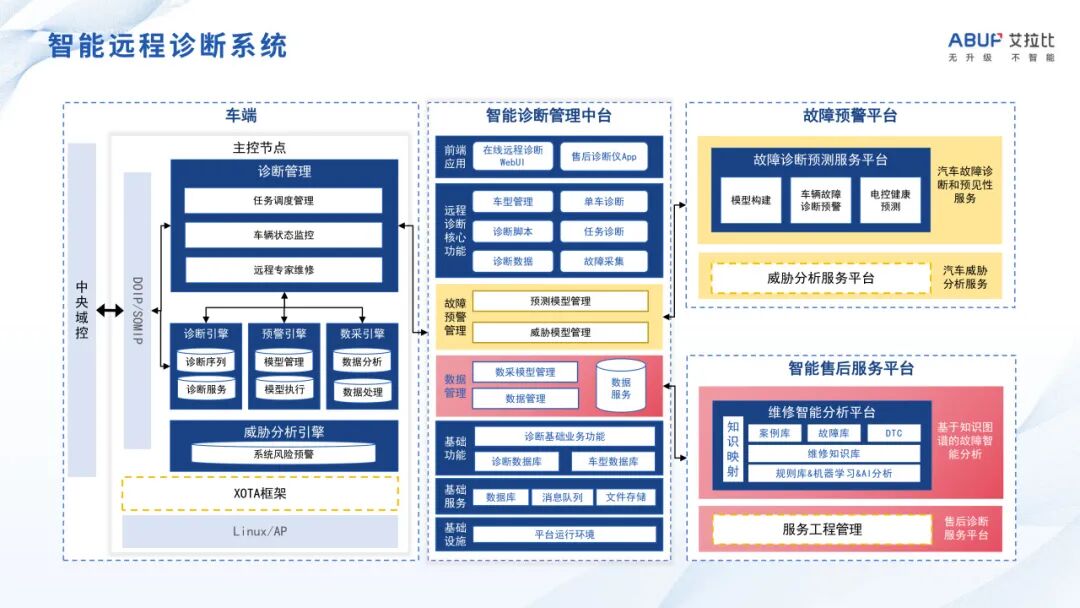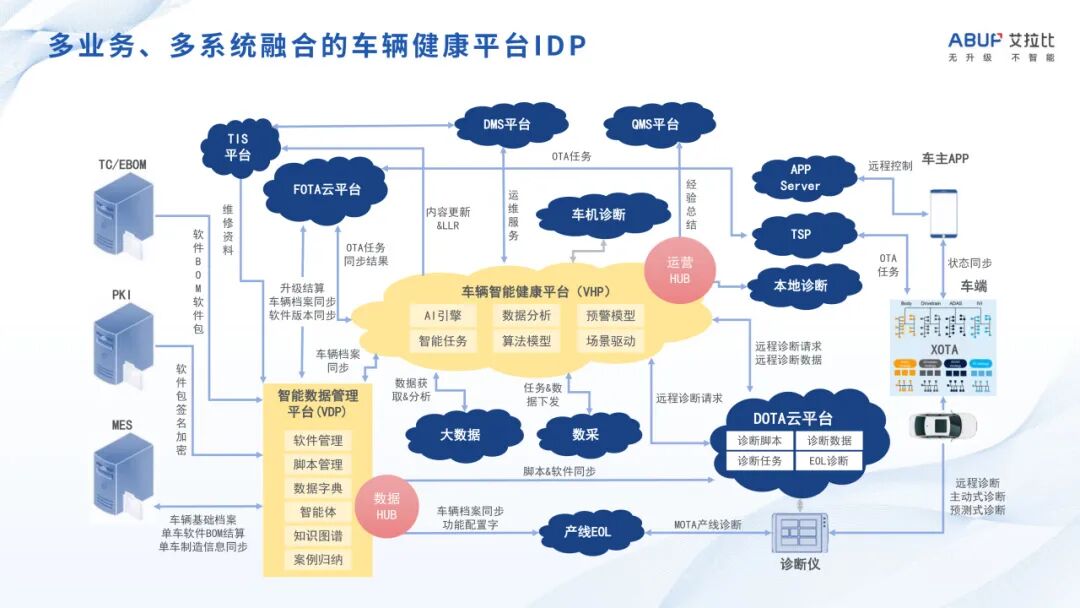 全球化能力方面,艾拉比为出海车企提供一站式托管运营服务,包括WP 29 R156合规咨询、OTA海外建设改造、云平台资源部署、CDN应用。同时,也提供出海车辆常用软件产品如地图、语音、应用商城。同时艾拉比为出海车辆提供 OTA测试验证、任务发布、市场售后支持。 02 智能诊断运营(IDP)服务: 数据驱动和诊断工具融合的全链路健康管理 艾拉比智能诊断运营IDP服务首次以全新概念展示了以数据驱动构建的“预测-诊断-修复”车辆健康管理闭环能力,精准施策车企质量与售后痛点。核心能力包括智能诊断、远程诊断、智能数采、多场景诊断仪以及诊断工具链。