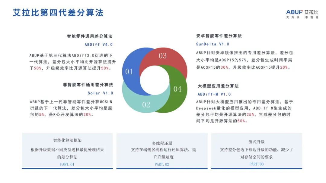 艾拉比AI-XOTA解决方案采用模块化架构设计,全面适配分布式、混合式,集中式等车型架构,通过云端协同与端侧执行的无缝联动,为智能驾驶域、智能座舱域、三电系统等功能提供灵活安全可靠的升级能力,精准发力。 艾拉比自研的第四代差分算法成为技术亮点,针对智能件、非智能件、安卓智能件、大模型应用实现全面提速提效。以智能件通用差分算法为例,ABDiff V4.0差分包大小平均是源包的5%,较上一代算法普遍提升20%,升级效率较上一代提升20%。