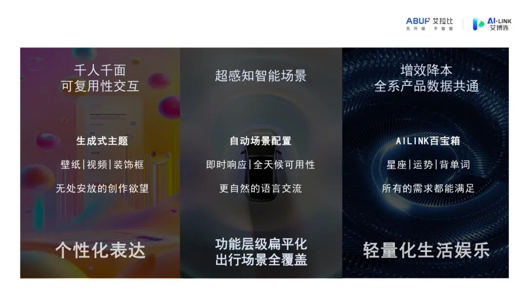 生产端,VSP的柔性刷写策略支持多车型共线生产,对于软件迭代频繁的ECU,供应商可直接提供白板件,软件版本变更周期从30天压缩至短短几天。 运营端,艾拉比软件运营平台通过自闭环或与主机厂已有系统集成,全面满足车辆软件运营的各项业务场景。平台不对企业现有IT架构推翻重建,只对原有系统做管理定位的调整就能理顺业务流程,各系统信息全面整合,准确及时的传递给相关部门。同时,各角色按工单任务执行工作,效率提升,同时便于进度跟踪。 04 AI-LINK智能交互平台: 多模态交互与场景化服务重塑座舱体验 作为艾拉比在智能座舱领域的革新方案,艾博连AI-LINK智能交互平台以“场景驱动”为核心,通过技术突破重新定义人车交互。