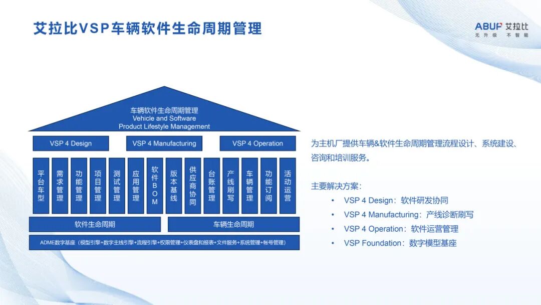 艾拉比智能化诊断产品利用大模型与图谱结合的双引擎,构建了庞大而详细的汽车故障知识库,整合了车辆的系统架构、零部件关系、故障现象、维修案例以及相关技术文档等多源信息。通过新一代GraphRAG技术,将这些离散的信息进行有机整合,形成了一个结构化、语义化的知识网络。 不仅如此,艾拉比的优势更在于将诊断、OTA、软件平台管理能力与AI深度融合,打造出新一代的智能诊断平台。 平台不仅解决了知识图谱构建高难度、高成本的问题,同时极大缩短了数千信号筛选与失效模型关联的管理编辑时间。在问题检索和问答方面,利用大语言模型的优势,提供了更精准、更高效的解决方案。智能诊断平台不仅能够有效维护信号、数据、模型与诊断策略逻辑,更通过知识图谱将各个模型、远程工具和系统紧密串联,将智能服务的功能深入到各个环节。 针对产线质量控制,艾拉比推出的MOTA方案在总装线旁部署边缘数采模块,实时监控ECU刷写状态。 此外,支持DoIP、J2534等多协议的ABOX诊断仪,兼容95%主流ECU,成为售后技师的“全能工具箱”。 03 整车软件生命周期管理(VSP): 数字主线串联研产运全流程 VSP平台以ADME基座为核心,打通软件研发、生产与运营的全生命周期。