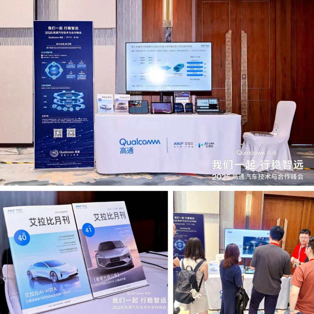 6 月 26 日至 27 日,2025高通汽车技术与合作峰会在苏州国际会议酒店隆重举办。艾拉比作为高通智能化生态合作伙伴,携基于高通芯片平台的汽车智能化解决方案亮相峰会,展示了基于高通芯片的产品方案和成果,携手高通持续赋能全球智能汽车的发展。