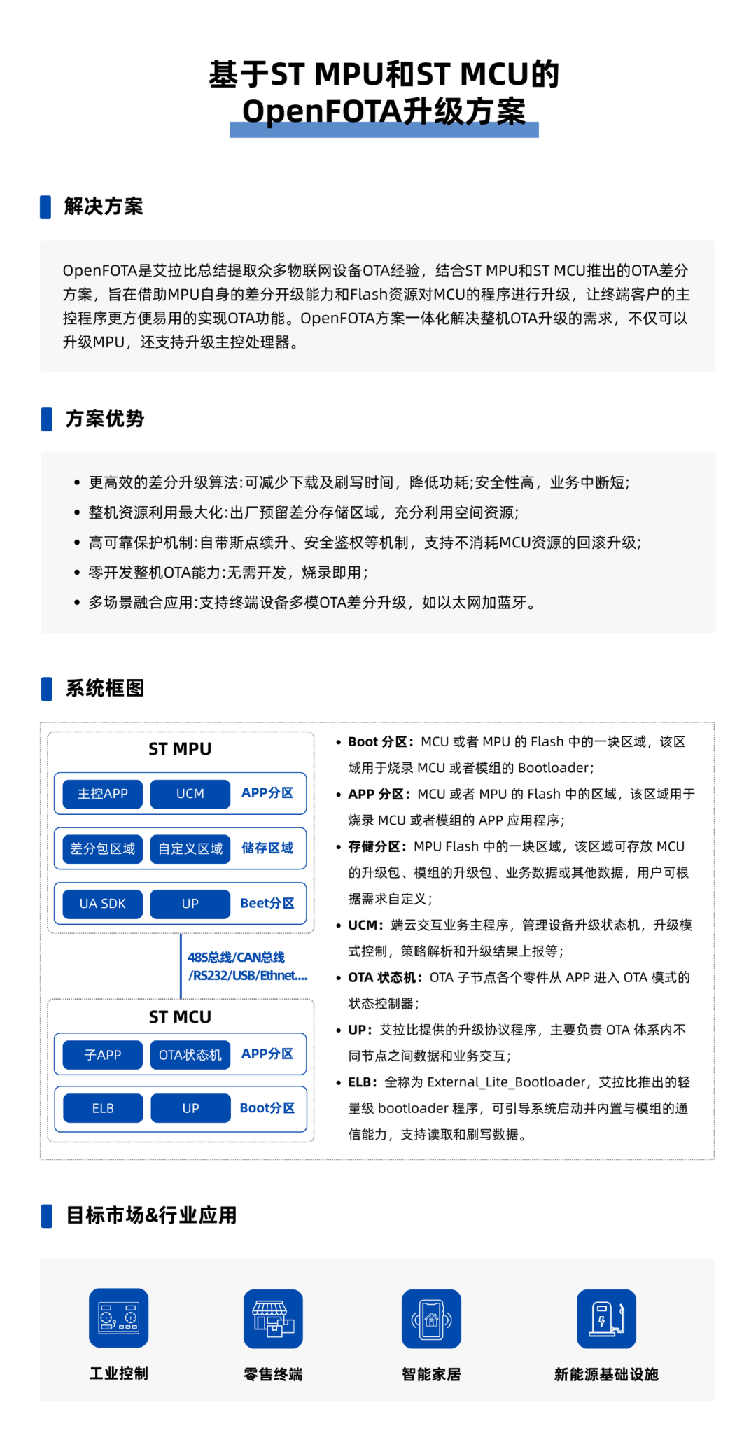 OpenFOTA是艾拉比于2021年携手ST、广和通联合发布的OTA差分升级创新方案。经过多年的技术创新和经验沉淀,通过艾拉比不断进化的差分能力,来对STM32 MCU进行OTA差分升级,高效地解决了整机终端在主控处理器资源不足的痛点,帮助终端厂商在不增加硬件成本的情况下,以更便捷、更省成本的方式实现稳定、高效、可靠的OTA差分升级。